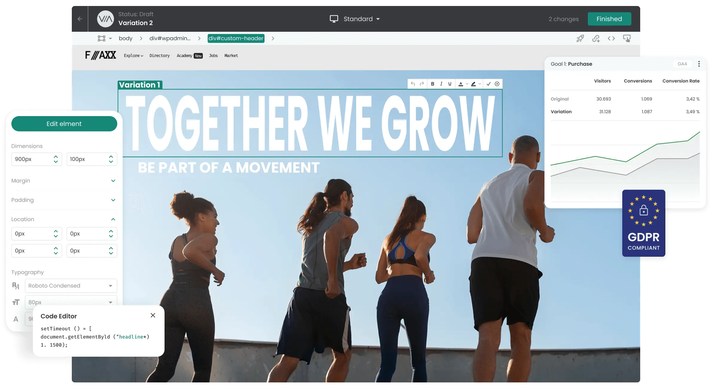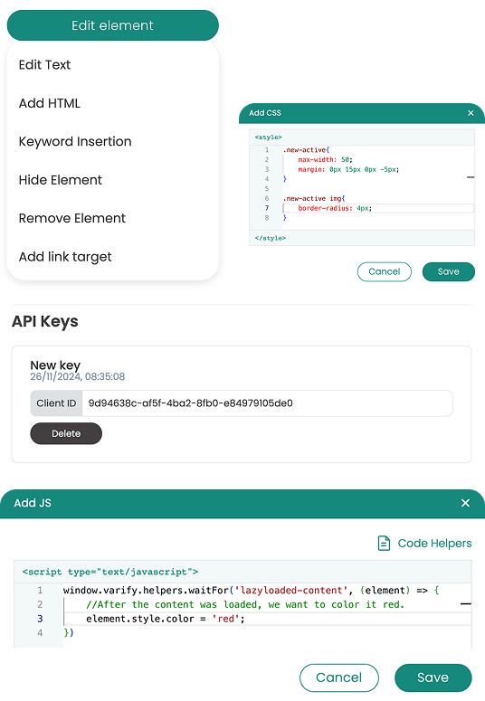 Use the visual editor or customize tests further with JavaScript / CSS thanks to our provided code helpers.