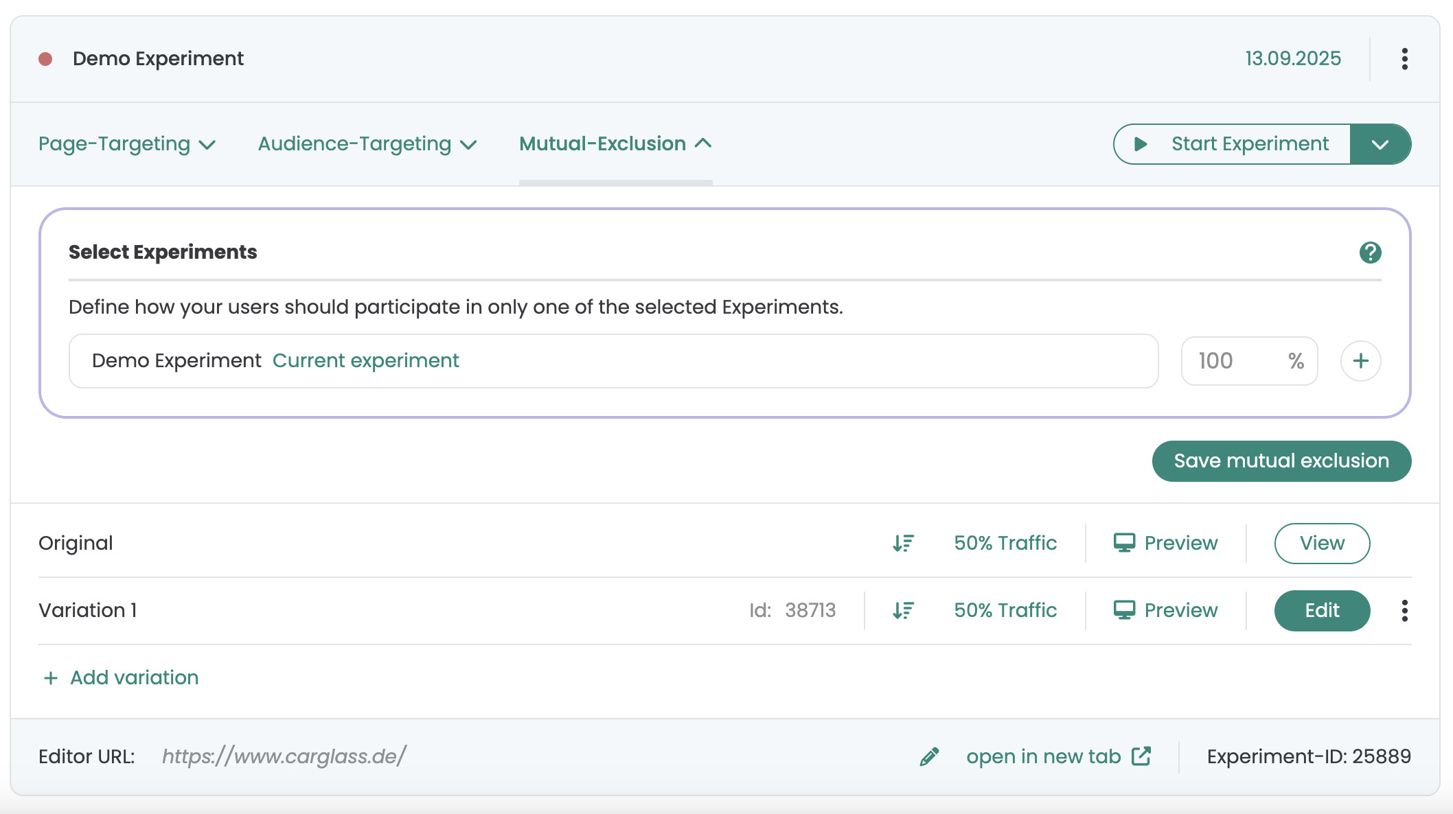 In addition to Page Targeting and Audience Targeting, you will find the "Mutual Exclusion" tab. Here you can define which experiments may not be delivered at the same time as the current experiment. All experiments contained in this defined group are excluded from being played out at the same time as each other. You can also configure the traffic distribution for the delivery of the experiments to each other.